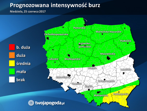 Dzisiaj słabe burze mogą występować miejscami w wielu regionach kraju. Najsilniejsze będą na południowym wschodzie. W strefie żółtej w ciągu jednej godziny może spaść do 30 mm deszczu, przez co możliwe są lokalne podtopienia dróg i zabudowań. Grad może mieć średnicę do 3 cm i uszkadzać dachy zabudowań, karoserie samochodowe i uprawy. Porywisty wiatr, osiągający do 90 km/h, może dodatkowo zrywać linie energetyczne i łamać gałęzie. W strefie zielonej spodziewamy się ulewnego deszczu do 15 mm, z gradem o średnicy do 1 cm i porywistym wiatrem do 80 km/h.