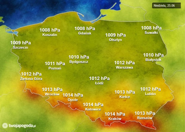 Ciśnienie spada, zacznie się stabilizować dopiero późnym popołudniem. W tej chwili wynosi ono od 1008 hPa (lekko obniżone) na północy do 1014 hPa (w nomie) na południu kraju.