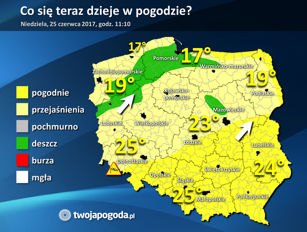 Na południu, wschodzie i w centrum kraju jest słonecznie, miejscami bezchmurnie. Na zachodzie i północy chmurzy się, a miejscami zaczęło przelotnie padać. Wkrótce mogą w tej strefie pojawiać się słabe burze. Późnym popołudniem gwałtowniejsze burze spodziewane są na południowym wschodzie. Wiatr wieje z południowego zachodu, na północy w porywach do 50-60 km/h, a w Sudetach powyżej 80 km/h. Temperatura wynosi od 17 stopni na północy do 25 stopni na południu.