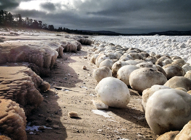 Lodowe tsunami to nie jedyna atrakcja Wielkich Jezior. Zimą są nią również znacznych rozmiarów lodowe kule, które szczelnie pokrywają brzegi. Szczególnie upodobały sobie one jezioro Michigan. Jedne kule są mniejsze, inne większe, ale wszystkie idealnie okrągłe, jakby ktoś je wyszlifował.