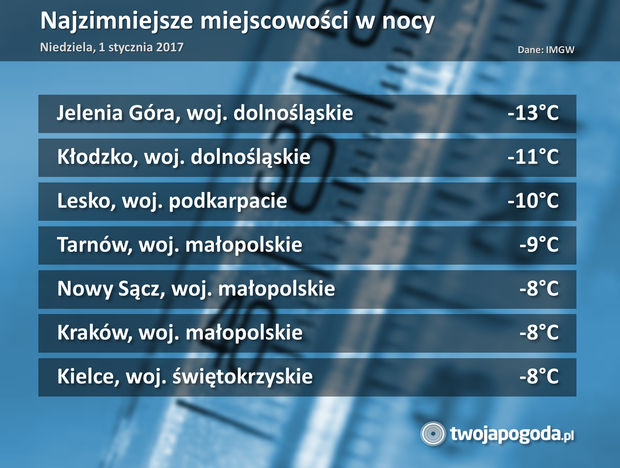 To była mroźna noc w południowej części kraju, gdzie niebo było wolne od chmur i usiane gwiazdami. W Jeleniej Górze temperatura spadła do minus 13 stopni, w Kłodzku do minus 11 stopni, a w Lesku do minus 10 stopni. Jeszcze mroźniej było przy gruncie, aż minus 17 stopni w Kłodzku i minus 15 stopni w Jeleniej i Lesku. Wśród najzimniejszych miast znalazły się m.in. Tarnów, Nowy Sącz, Kraków, Kielce, Wrocław czy Zakopane. Im dalej na północ kraju, tym z powodu chmur było cieplej. W Helu do rana temperatura nie spadła poniżej plus 3 stopni.