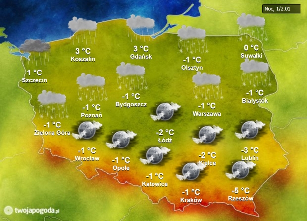 Noc w północnej połowie kraju przyniesie opady deszczu przechodzące, wraz ze swoją wędrówką w kierunku południowym, w deszcz ze śniegiem i w sam śnieg. Jednocześnie temperatura będzie tam spada poniżej zera, a krajobrazy mogą się zabielić. Drogi i chodniki z powodu oblodzenia mogą być śliskie. W południowej połowie kraju utrzyma się pogodne niebo, będzie też na minusie.