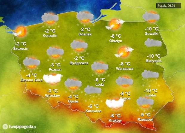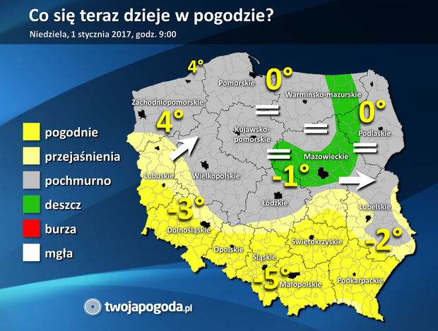 Na południu kraju utrzymuje się wolne od chmur niebo. Na pozostałym obszarze chmurzy się, a miejscami pada niewielka mżawka. Na Kujawach, Warmii, północnym Mazowszu i Podlasiu zalegają gęste mgły, które ograniczają widoczność do 200-300 metrów. Kierowców prosimy o ostrożność. Wiatr wieje słabo z południowego zachodu i zachodu. Temperatura wynosi od poniżej minus 10 stopni w kotlinach górskich do 4 stopni na wybrzeżu.