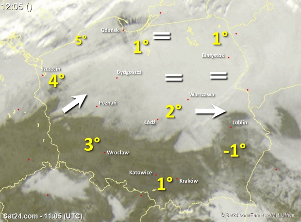 Na południu kraju w dalszym ciągu jest pogodnie i bezchmurnie. Nad pozostałym obszarem wiszą niskie chmury warstwowe, z powodu których jest pochmurno, a miejscami również mglisto. Widoczność może być ograniczona do 200-300 metrów. Wiatr wieje słabo z południowego zachodu. Temperatura wynosi od minus 5 stopni na Podkarpaciu do 5 stopni nad morzem.
