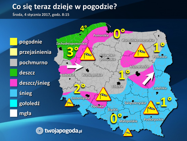 Poranek w całym kraju jest pochmurny, w wielu miejscach również występują opady, w zależności od temperatury pada deszcz, deszcz ze śniegiem lub śnieg. Na południu, wschodzie i w centrum przy porywistym wietrze z południowego zachodu mamy intensywne zawieje śnieżne, znacznie ograniczające widoczność na drogach. Kierowców prosimy o ostrożność. Podmuchy wiatru chwilami dochodzą do 60-70 km/h, a wysoko w górach przekraczają 90 km/h. Temperatura wynosi od minus 2 stopni na Podkarpaciu do 4 stopni na wybrzeżu.