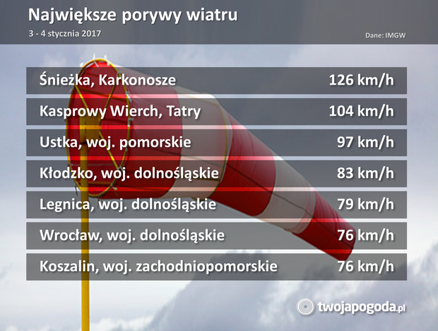 Dotychczas najmocniej wiało tradycyjnie wysoko na szczytach górskich. Na Śnieżce w Karkonoszach porywy wiatru osiągały 126 km/h, a na Kasprowym Wierchu w Tatrach do 104 km/h. Na nizinach najbardziej wietrzna była Ustka, gdzie na plażach dmuchało do 97 km/h. Wiatr wznieca zawieje śnieżne, z powodu których nie widać chwilami niczego w promieniu powyżej 100 metrów.