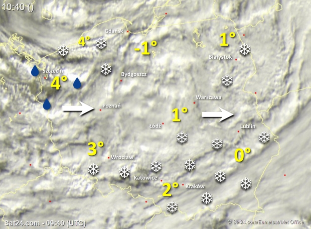 Prawie w całym kraju jest pochmurno. Nieduże przejaśnienia pojawiają się tylko na zachodnim Pomorzu i Górnym Śląsku. Na południu i wschodzie prószy śnieg, który przy silnym wietrze ma postać zawiei śnieżnych. Na północnym zachodzie pada deszcz. Wiatr w porywach osiąga 60-70 km/h. Temperatura wynosi od minus 2 stopni w Bieszczadach do 4 stopni na Pomorzu.