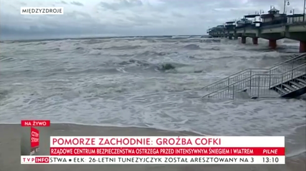 Na wybrzeżu wieje w porywach do 90 km/h z kierunku północnego, a to oznacza, że woda morska wdziera się do koryt rzecznych powodując niebezpieczną cofkę. Nadmorskim miejscowością grożą podtopienia. Alarm przeciwpowodziowy ogłoszono zwłaszcza w zachodniej części wybrzeża. Plaża w Międzyzdrojach niemal w całości jest zatopiona, na co wskazuje obrazek z telewizji TVP Info.