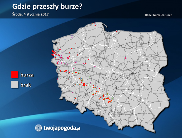 Na poniższej mapie możecie zobaczyć, gdzie dzisiaj po południu przeszły burze. Były to głównie regiony zachodnie i południowe, jednak miejscami zagrzmiało też na północy i w centrum. Grzmoty były na tyle głośne, że nie sposób było ich nie usłyszeć. Skąd się biorą burze w styczniu? Przeczytajcie nasz artykuł sprzed roku... Dowiedz się więcej