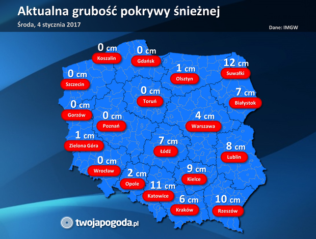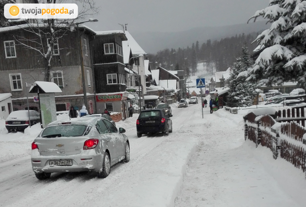 Na zachodzie kraju jeszcze wczoraj było biało, jednak dodatnia temperatura w nocy i opady deszczu skutecznie śnieg roztopiły. Najwięcej białego puchu w ciągu minionej doby przybyło na południu i wschodzie kraju, miejscami nawet ponad 10 cm. Obecnie najgrubszą pokrywę mamy m.in. na Wyżynie Śląskiej, Wyżynie Krakowsko-Częstochowskiej, na Suwalszczyźnie i Podkarpaciu, gdzie leży powyżej 10 cm śniegu. W Zakopanem mamy 25 cm białego puchu, a na Kasprowy Wierchu aż 105 cm. W ciągu dnia spodziewane są powolne ochłodzenie, a to oznacza, że nawet tam, gdzie teraz pada deszcz, przejdzie on w śnieg. Poprószyć może niemal wszędzie.