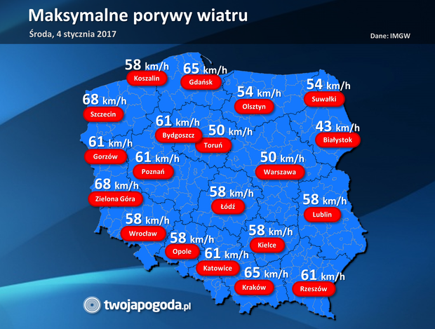Wieje porywiście z zachodu, przeważnie w porywach do 50-60 km/h. Najmocniejszy wiatr odnotowano w Kłodzku - 83 km/h, Legnicy - 79 km/h, w Ustce i Sulejowie - 76 km/h. We wschodniej połowie kraju występują zawieje śnieżne, które znacznie ograniczają widoczność na drogach.