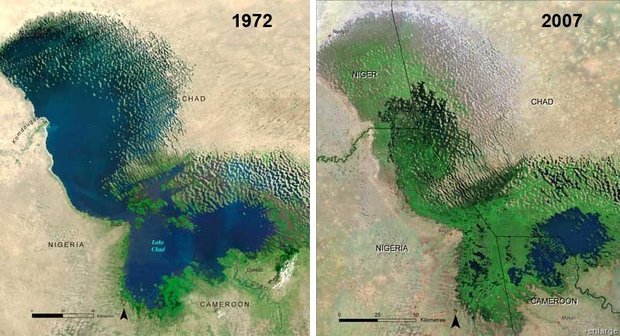 Skutki suszy najdotkliwiej odczuwają mieszkańcy północnej i wschodniej Afryki. Jednym z epicentrów suszy jest bezodpływowe jezioro Czad, które stanowi źródło utrzymania dla około 100 milionów ludzi. Jeszcze 50 lat temu jego powierzchnia wynosiła 25 tysięcy kilometrów kwadratowych. Obecnie to już niecałe 2 tysiące km kw.