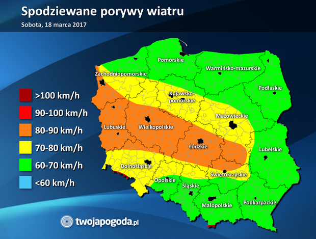 Najmocniej wiało w Wielkopolsce i na Ziemi Lubuskiej, gdzie podmuchy wiatru przekraczały 85 km/h. W Poznaniu i Kaliszu wiało do nawet 90 km/h. Najsłabszy wiatr mieliśmy na północnym wschodzie, w porywach do 43 km/h... Dowiedz się więcej