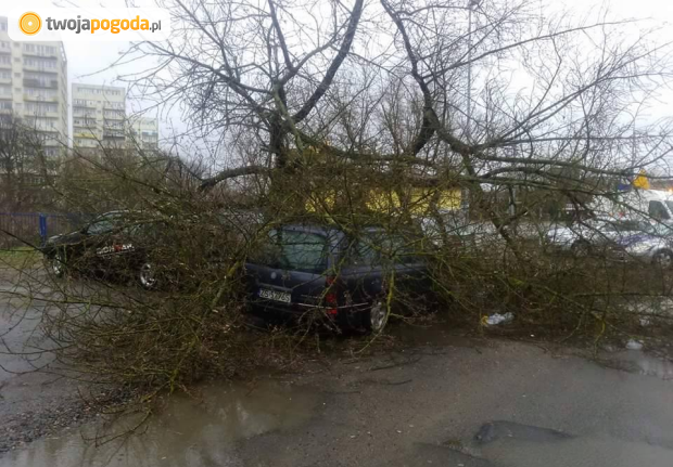 W ostatnim czasie najmocniej wiało w Poznaniu i Zielonej Górze, gdzie porywy osiągały od 85 do 90 km/h, a w Gorzowie, Lesznie i Świnoujściu od 80 do 85 km/h. @Sebastian przesłał nam zdjęcie drzewa powalonego na samochody w Szczecinie. Wiatr dochodził tam do 75 km/h. Czytelnicy donoszą nam o przerwach w dostawach energii elektrycznej. Kilka tysięcy odbiorców nie ma prądu, głównie w Wielkopolsce, na Ziemi Lubuskiej i zachodnim Pomorzu.