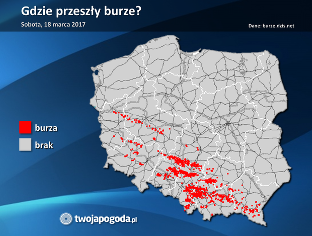 Jeśli interesują Was szczegółowe dane o tym, gdzie wiało dzisiaj najmocniej i gdzie przeszły burze, to mamy dla Was specjalne mapy. Najpierw o tym, gdzie zagrzmiało, bo o tej porze roku jest to zjawisko niecodzienne. Jak wskazują czerwone punkty, czyli lokalizacje wyładowań atmosferycznych, grzmiało od Ziemi Lubuskiej i Wielkopolski przez Śląsk i Ziemię Łódzką po Kielecczyznę, Małopolskę i Podkarpacie. W sumie odnotowano kilka tysięcy błyskawic.