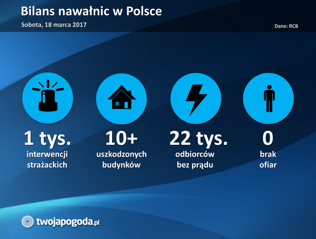 22 tysiące odbiorców bez prądu, setki połamanych drzew, kilkanaście uszkodzonych dachów, kilkadziesiąt zniszczonych samochodów i prawie tysiąc interwencji strażackich to skutek wczorajszych (18.03) nawałnic nad Polską.