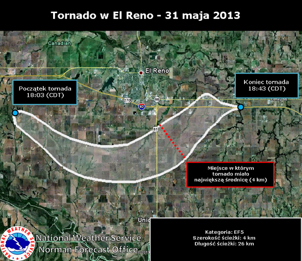 Jednocześnie pomiary pasa zniszczeń wykazały, że tornado nieco na wschód od drogi nr 81 miało średnicę aż 4 kilometrów i było najszerszym jakie kiedykolwiek obserwowano. Poprzedni rekord należał do tornada o kategorii EF4, które 22 maja 2004 roku przeszło przez miejscowości Wilber i Hallam w stanie Nebraska.
