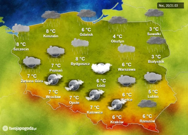 Pod osłoną nocy, najpierw na północy, a potem także na wschodzie kraju, deszcz przeszedł w śnieg, a krajobrazy zaczęły się zabielać. Nic więc dziwnego, że mieszkańcy Pomorza, Warmii, Mazur, Mazowsza, Kielecczyzny i Lubelszczyzny mogą zobaczyć na oknami swych domów iście zimowe widoki i to w pierwszy dzień astronomicznej wiosny. Spadły 1-2 cm białego puchu. Nowa pora roku przyjdzie jednak o czasie, a jeszcze dzisiaj śnieg roztopi się.