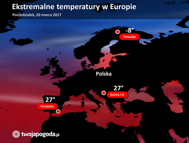 W Europie wiosna zaczyna się zarówno mrozem, jak i niemal upałem. W najcieplejszym momencie dnia w północnej Finlandii było minus 8 stopni. Tymczasem na południu Hiszpanii i w Bośni i Hercegowinie w tym czasie zmierzono przyjemne 27 stopni. Czy rzeczywiście zaczęła się wiosna? Bo mapka pokazuje, że na północy wciąż trwa zima, a na południu jest już lato.