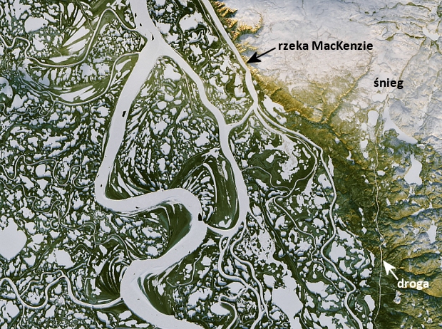 Rzeka MacKenzie w Kanadzie w porze zimowej służy mieszkańcom, jak i kierowcom ciężarówek, jako system lodowych dróg. Dzięki jeździe po zamarzniętym korycie rzeki można szybciej dostać się do sąsiednich miejscowości. Jednak lodowe szlaki mają swoje minusy, bo można je przemierzać jedynie przez kilka najzimniejszych miesięcy w roku, w dodatku pojazd nie może ważyć więcej niż 10 ton, w przeciwnym razie lód może się załamać. Pod koniec tego roku ukończona zostanie nowa droga, która zapewni mieszkańcom komunikację przez okrągły rok, w każdych warunkach atmosferycznych. Na poniższym zdjęciu satelitarnym możecie zobaczyć, jak piękny jest to kawałek świata, gdzie delta rzeka i otaczające ją tereny podmokłe kontrastują z ośnieżonymi górami.