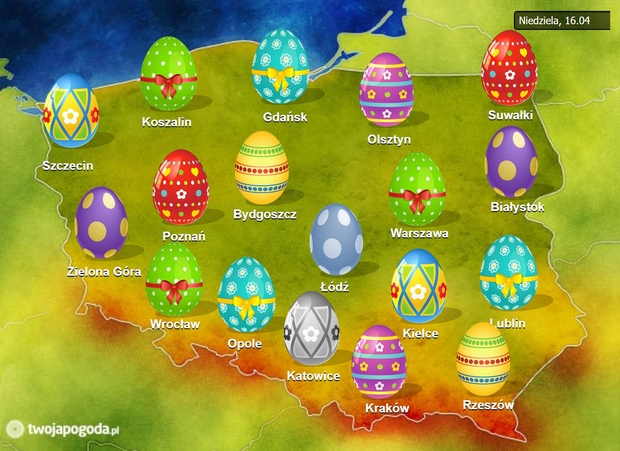 Na naszej mapie pogodowej na Wielkanoc zamiast deszczowych chmurek, znajdziecie pisanki z niespodzianką, a w nich pogoda taka, jaką sobie wymarzycie. Oprócz pięknej aury z okazji Świąt Zmartwychwstania Pańskiego życzymy Wam też radosnej atmosfery spędzonej w kręgu najbliższych podczas wspólnego przeżywania tych niezwykłych dni. Wesołego Alleluja!
