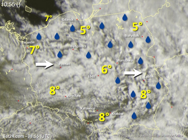 Na północy, wschodzie i południu kraju jest pochmurno i deszczowo. Na pozostałym obszarze opady ustały, a niebo przejaśnia się lub rozpogadza. Wiatr wieje z zachodu, w porywach do 40-50 km/h. Temperatura wynosi od 3-4 stopni na wschodzie do 6-7 stopni na południu kraju.