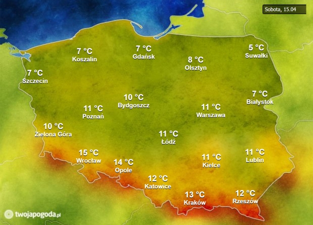 Dzisiaj jedyny tak ciepły dzień w najbliższym czasie. Termometry pokazują na południu kraju nawet 15 stopni. Jednak są też miejsca dużo zimniejsze. Na przykład na Suwalszczyźnie odnotowano zaledwie 9 stopni, a odczuwalnie, z powodu silnego wiatru i opadów, było tylko 5 stopni.
