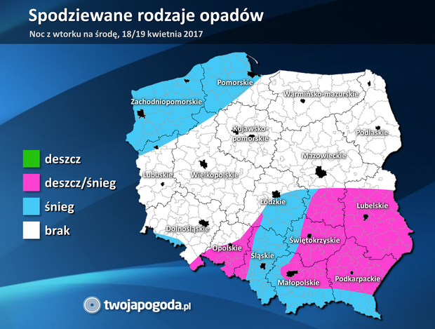 Poniższą mapkę przygotowaliśmy dla tych, którzy nie zdążyli przejrzeć prognoz na noc i poranek. Jeden rzut oka i już wiecie czego możecie się spodziewać za oknem.