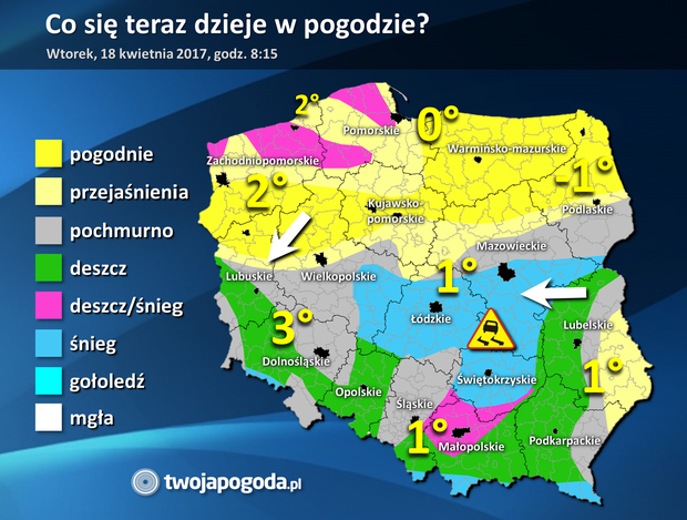 W północnej połowie kraju niebo przejaśnia się i rozpogadza. W południowej połowie jest pochmurno i mokro. Pada zarówno deszcz, jak i śnieg. Chwilami opady są intensywne i mogą znacznie ograniczać widoczność. Na Ziemi Łódzkiej i Kielecczyźnie warunki drogowe z powodu opadów śniegu są trudne. Wiatr wieje słabo i umiarkowanie ze wschodu. Na termometrach mamy od zera stopni w Górach Świętokrzyskich do 8 stopni na Zamojszczyźnie.