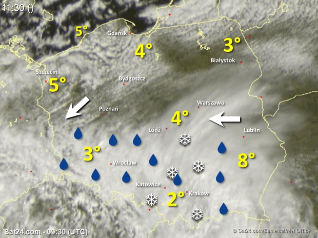 W północnej połowie kraju niebo przejaśnia się i rozpogadza. Na pozostałym obszarze chmurzy się i pada, w zależności od temperatury, deszcz, deszcz ze śniegiem i śnieg. Najmocniejsze opady śniegu przechodzą nad Mazowszem, Ziemią Łódzką i Kielecczyzną. Warunki drogowe mogą być tam utrudnione. Strefa opadów powoli przesuwa się w kierunku południowym. Wiatr wieje ze wschodu i północy. Temperatura wynosi od minus 1 stopnia na północnym wschodzie do 4 stopni miejscami na zachodzie i południu kraju.