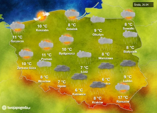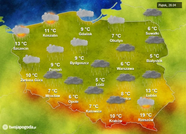W strugach ulewnego deszczu temperatura będzie bardzo niska, przez całą dobę oscylująca w granica od 5 do 8 stopni. Dla porównania na zachodzie i północy kraju padać będzie znacznie mniej, a termometry będą pokazywać od 10 do 15 stopni.