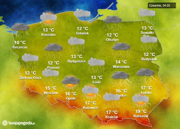 W czwartek (4.05) chmurzyć się będzie w całej Polsce, w dodatku wszędzie też spodziewamy się opadów deszczu, które w wielu miejscach będą miały charakter ciągły i duże natężenie. W południowej połowie kraju mogą im towarzyszyć burze o słabej i umiarkowanej intensywności.