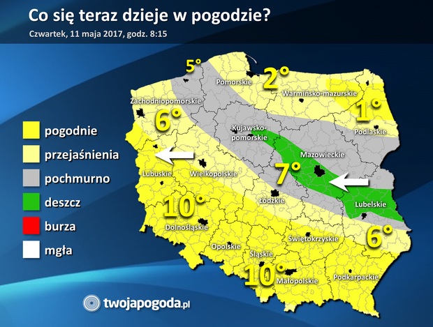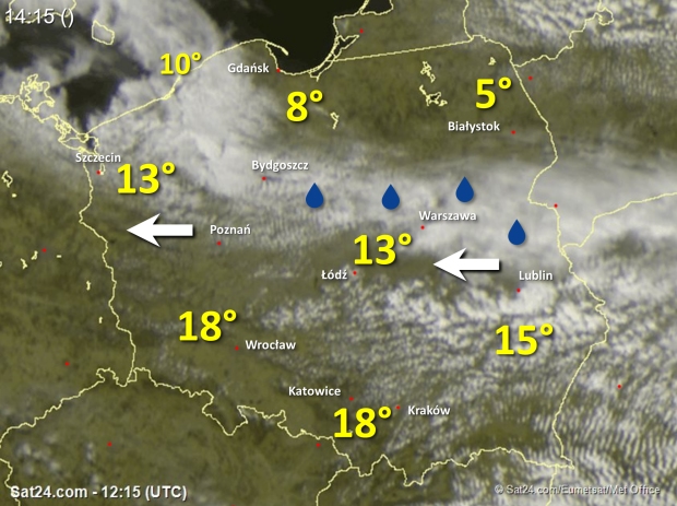 Na przeważającym obszarze kraju jest słonecznie. Jedynie w pasie od Pomorza przez Kujawy i Mazowsze po Lubelszczyznę chmurzy się i tam lokalnie pada deszcz. Wiatr wieje słabo i umiarkowanie ze wschodu. Na termometrach mamy od 5 stopni na Suwalszczyźnie i północnym Mazowszu do 18 stopni na Śląsku, w Małopolsce i na Podkarpaciu.