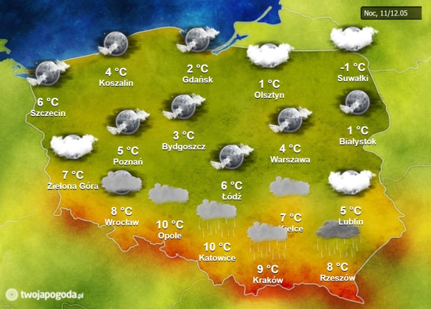 Noc na południu kraju przyniesie opady deszczu, zwłaszcza w swojej drugiej połowie. Na pozostałym obszarze będzie pogodnie. Tylko na północnym wschodzie spodziewamy się niedużych przymrozków. Termometry pokażą do minus 1 stopnia na Suwalszczyźnie do 10 stopni na Śląsku.