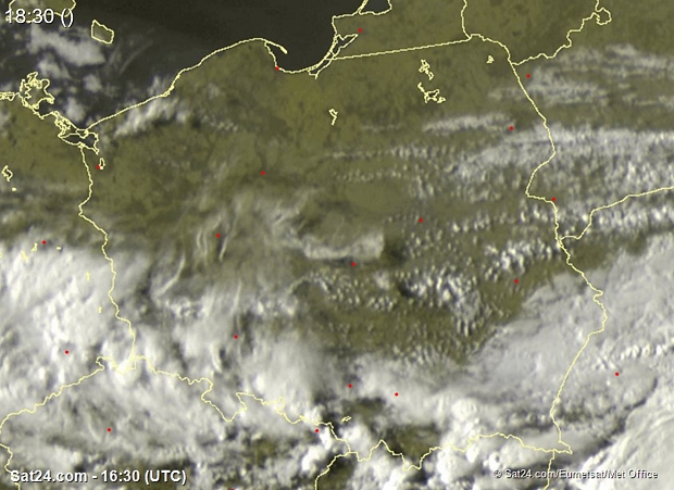 Zdjęcie satelitarne w dniu 12 maja 2017 o godzinie 18:30. Dane: Sat24.com / Eumetsat.