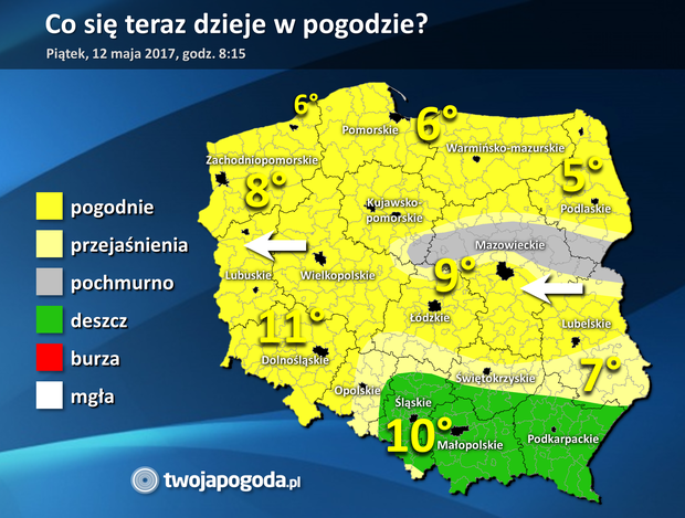 Piątek na przeważającym obszarze kraju rozpoczyna się słonecznie, nawet bezchmurnie. Jednak nie wszędzie jest tak ładnie. Na południu jest pochmurno i deszczowo. Opady mają tam natężenie umiarkowanie i duże. Wkrótce pojawią się tam burze. Z kolei nad Mazowszem i okolicami utworzył się pas dużego zachmurzenia spowodowany wczorajszymi opadami w tym regionie i ich parowaniem. W następnych godzinach chmury będą ustępować. Wiatr wieje słabo i umiarkowanie ze wschodu. Temperatura wynosi od 5 stopni na północy do 12 stopni na południu.
