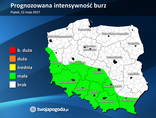 Dzisiaj w południowej części kraju mogą przejść słabe burze. W strefie zielonej spodziewamy się ulewnego deszczu do 15 mm, lokalnie z gradem o średnicy do 1 cm i wiatrem do 80 km/h.
