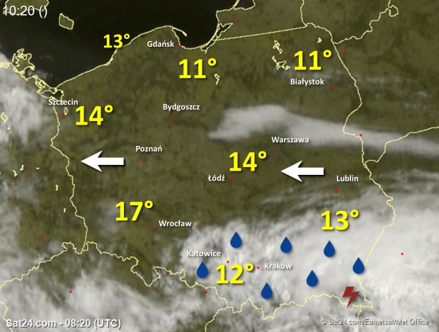 W większości regionów kraju utrzymuje się słoneczna, bezchmurna pogoda. Chmurzy się nad północnym i wschodnim Mazowszem, a także na południu kraju, gdzie pada deszcz, chwilami intensywnie. W Bieszczadach towarzyszą mu słabe burze. Z biegiem godzin strefa opadów i burz rozszerzy się na całe południe. Na pozostałym obszarze będzie sucho i pogodnie. Wiatr wieje słabo i umiarkowanie ze wschodu. Temperatura błyskawicznie rośnie i wynosi już od 10-11 stopni na północy do 20 stopni na południowym zachodzie.