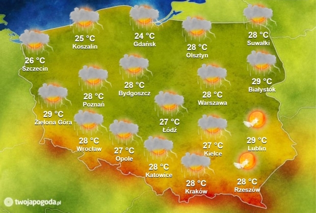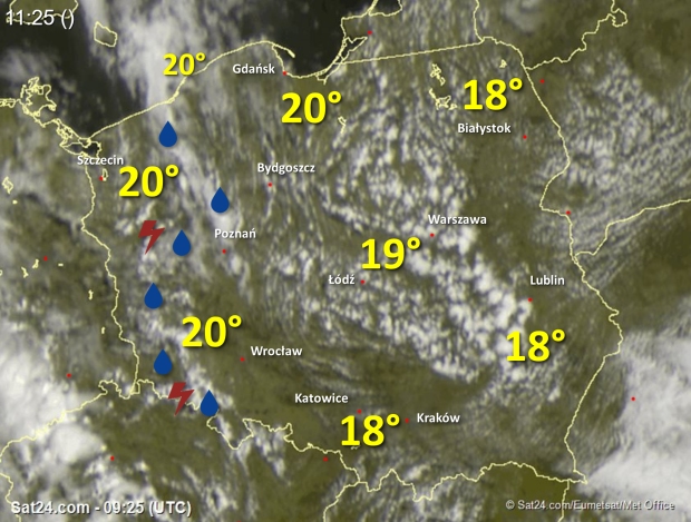 Chmur przybywa, ale tylko w zachodniej części kraju zaczęły one przynosić przelotne opady deszczu i burze. Wiatr wieje słabo ze zmiennych kierunków. Temperatura waha się od 15 stopni na krańcu południowo-wschodnim do 21 stopni na zachodzie kraju.