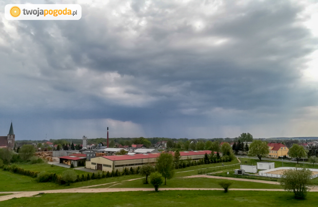 Nad zachodnią częścią kraju, zgodnie z prognozami, przechodzą burze o małym i umiarkowanym natężeniu. Miejscami pada deszcz o natężeniu 10-15 mm na godzinę oraz grad o średnicy do 1-2 cm. Z okolic Drawska Pomorskiego otrzymaliśmy zdjęcie chmury burzowo-deszczowej: