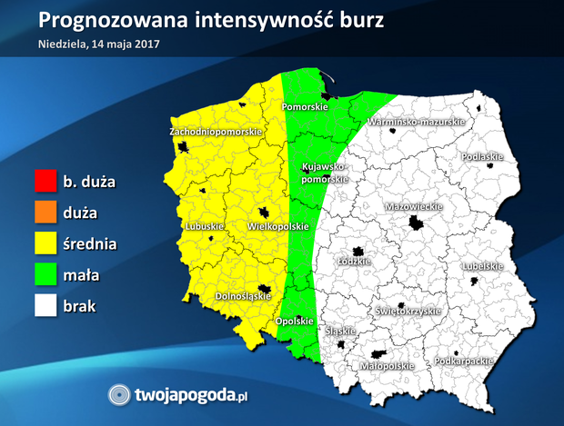 Burze gradowe i ulewne deszcze przeszły po południu nad zachodnimi regionami kraju. Miejscami podczas burz w ciągu jednej godziny potrafiło spaść nawet od 10 do 20 mm deszczu, co skończyło się lokalnymi podtopieniami. Tak było m.in. w Lubinie w woj. dolnośląskim, gdzie spadła gruba warstwa drobnego gradu, która po roztopieniu się spowodowała zalania dróg, posesji i zabudowań.