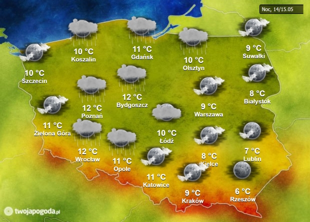 W nocy strefa opadów będzie znad województw zachodnich wędrować w kierunku centrum. Na zachodzie rozpogodzi się, a na wschodzie utrzyma się pogodna aura. Termometry pokażą minimalnie od minus 6 stopni na południowym wschodzie do 12 stopni na zachodzie.