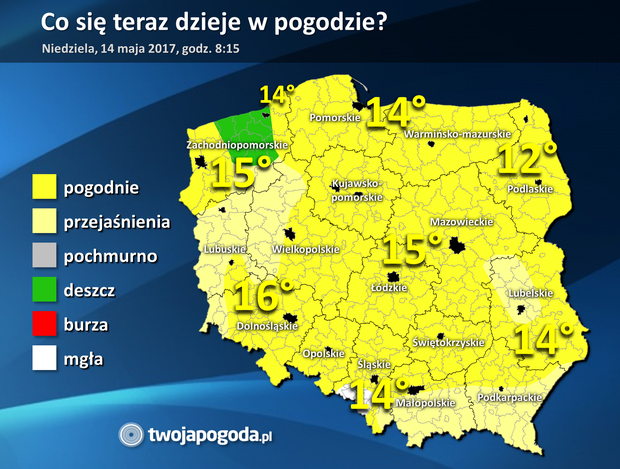 Niedzielny poranek przeważnie jest słoneczny, a nawet bezchmurny. Chmurzy się miejscami na zachodzie i południowym wschodzie, ale deszcz pada przelotnie jedynie na zachodnim Pomorzu. Wiatr wieje bardzo słabo ze zmiennych kierunków. Temperatura wynosi od 12 stopni na północnym wschodzie do 16 stopni na zachodzie.