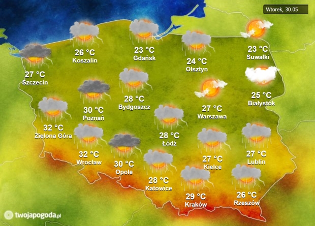 We wtorek (30.05) warunki do piętrzenia się chmur burzowych nad Polską będą wprost wyśmienite, ponieważ będą się nad nami ścierać dwie zupełnie odmienne masy powietrza. Najpierw napływać będzie gorące powietrze podzwrotnikowe, które przyniesie nam na termometrach od 23 stopni na północnym wschodzie do nawet 32 stopni na południowym zachodzie.