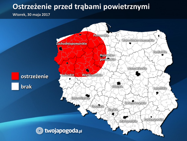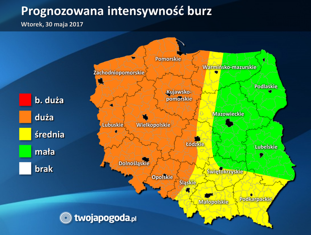 Na początku burze zaczną się pojawiać w zachodnich regionach kraju, w godzinach przedpołudniowych i południowych, i tam też będą najbardziej intensywne. Na Pomorzu, Kujawach i w północnej Wielkopolsce będzie podwyższone ryzyko powstawania trąb powietrznych.