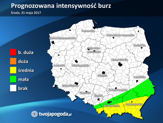 W środę (31.05) burze wrócą, ale jedynie na południowy wschód kraju, gdzie mogą mieć umiarkowane natężenie. W ciągu godziny może spaść do 30 mm deszczu, przez co możliwe są lokalne podtopienia dróg i zabudowań. Grad może mieć średnicę do 3 cm i uszkadzać dachy zabudowań, karoserie samochodowe i uprawy. Porywisty wiatr, osiągający do 90 km/h, może dodatkowo zrywać linie energetyczne i łamać gałęzie.