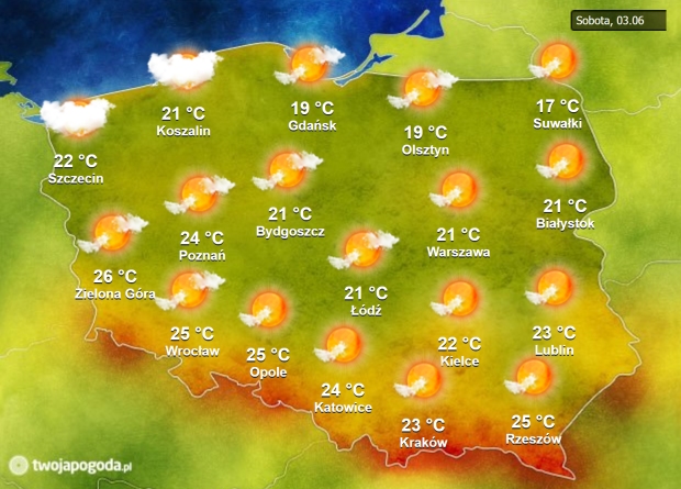 Jeśli mamy tylko taką możliwość, to korzystajmy z pięknej pogody, jaka będzie nas raczyć w sobotę (3.06) we wszystkich regionach naszego kraju. Spodziewamy się pogodnego, w wielu miejscach bezchmurnego nieba. Nigdzie nie powinno padać.