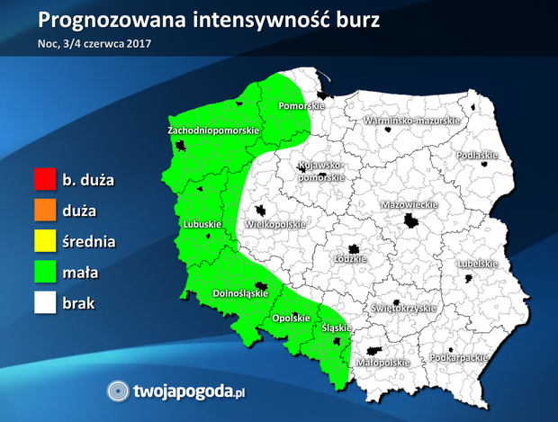 Ryzyko burz obejmuje niemal całą Polskę, jednak te najliczniejsze błyskawice powinny się pojawić zwłaszcza nad województwami południowymi, wschodnimi i centralnymi.