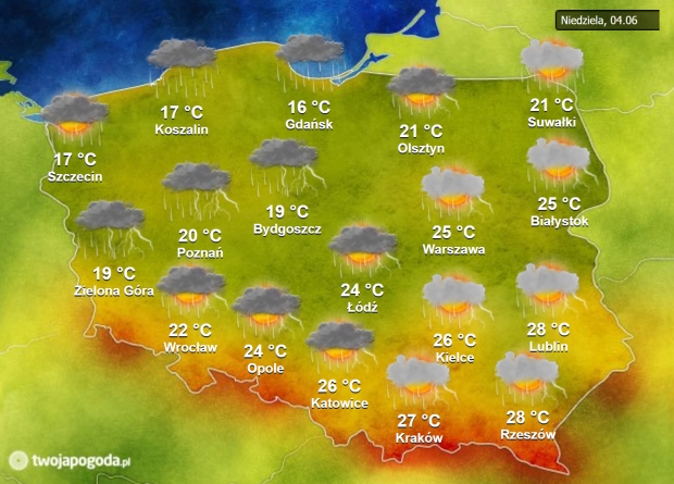 W niedzielę (4.06) z zachodu na wschód kraju będą wędrować chłodne fronty atmosferyczne, a wraz z nimi tradycyjnie przelotne, ale miejscami ulewne deszcze, a także gwałtowne burze z gradem i porywistym wiatrem.