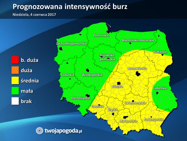 Dzisiaj burze mogą pojawić się niemal w całym kraju. W strefie żółtej w ciągu jednej godziny może spaść do 30 mm deszczu, przez co możliwe są lokalne podtopienia dróg i zabudowań. Grad może mieć średnicę do 3 cm i uszkadzać dachy zabudowań, karoserie samochodowe i uprawy. Porywisty wiatr, osiągający do 90 km/h, może dodatkowo zrywać linie energetyczne i łamać gałęzie. W strefie zielonej spodziewamy się ulewnego deszczu do 15 mm, z gradem o średnicy do 1 cm i porywistym wiatrem do 80 km/h... Dowiedz się więcej